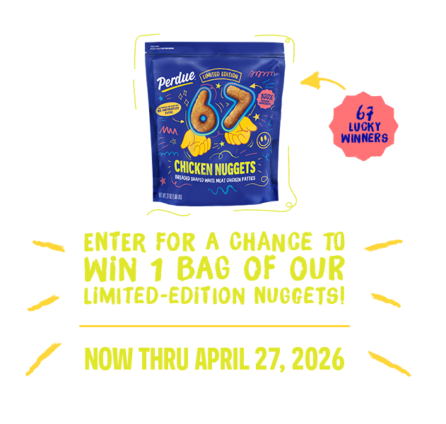 NO PURCHASE NECESSARY. Open to legal residents of 50 U.S./D.C., age 18+ (19+ AL/NE, 21+ MS). Void outside 50 U.S./D.C. and where prohibited. Starts 9:00a.m. ET on 04/16/2026; ends 11:59p.m. ET on 04/27/2026. Total ARV of sixty-seven (67) prizes: $6,500.00. For full Official Rules: [https://www.perdue.com/67-nugget-giveaway-rule-and-regulations ]. Sponsor: Perdue Foods LLC.