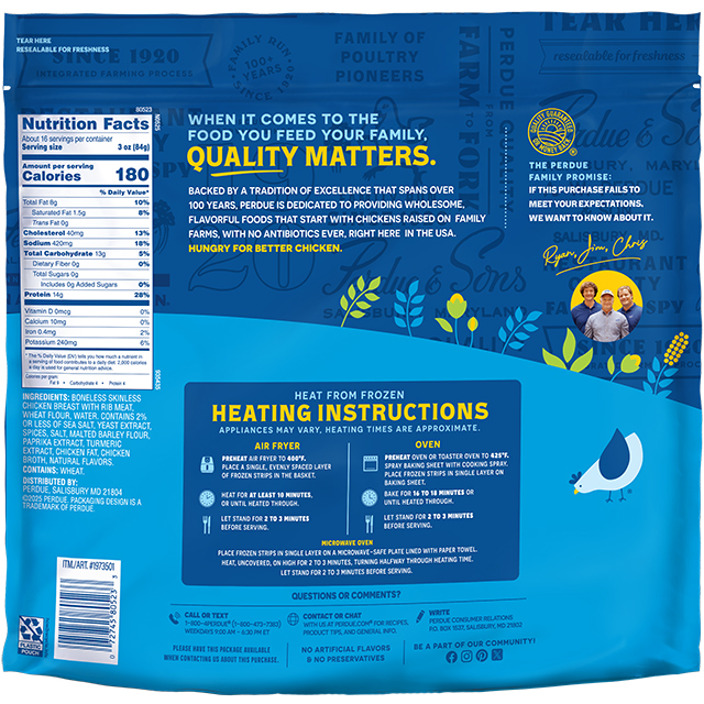 From freezer to table in minutes - PERDUE® Buffalo Style Glazed Chicken Strips are frozen and fully cooked for your convenience. Made with only white meat chicken breast strips, no fillers, and coated with a crispy, seasoned breading and buffalo glaze. They are an easy, dippable, snack or appetizer. Serve with your favorite ranch or blue cheese dip for an extra flavor punch!