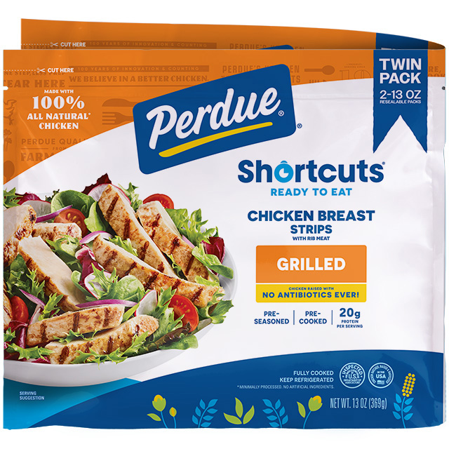 Grilled PERDUE® SHORT CUTS® Carved Chicken Breast are perfectly seasoned, fully cooked, chicken strips. Skip the grill and make meal prep a breeze. Whether you eat them right out of the bag or add them to your favorite salad, wrap, or pasta, these chicken strips are delicious and ready when you are!