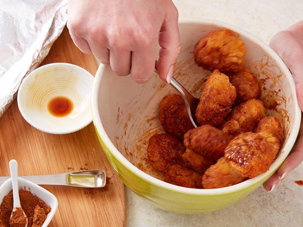 In a bowl toss the popcorn chicken, soy sauce and 5 spice powder until chicken is well coated.