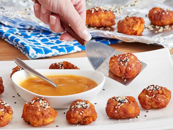 Serve the 5 Spice Sesame Popcorn Chicken with the Apricot dipping sauce.
