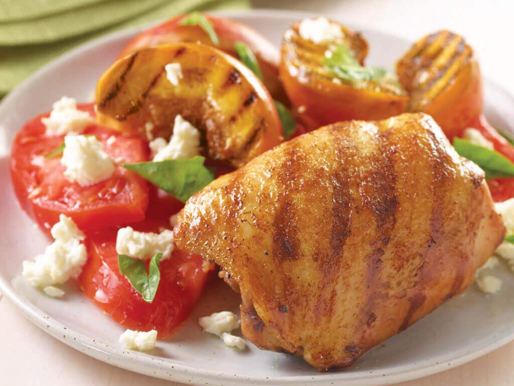 To serve Grilled Adobo Chicken Thighs With Tomato And Peach Salad, arrange the tomatoes and peaches on a serving platter. Season lightly with Adobo seasoning. Drizzle with the lemon dressing and crumbled queso blanco. Top with chicken thighs. Garnish with the remaining basil and serve.