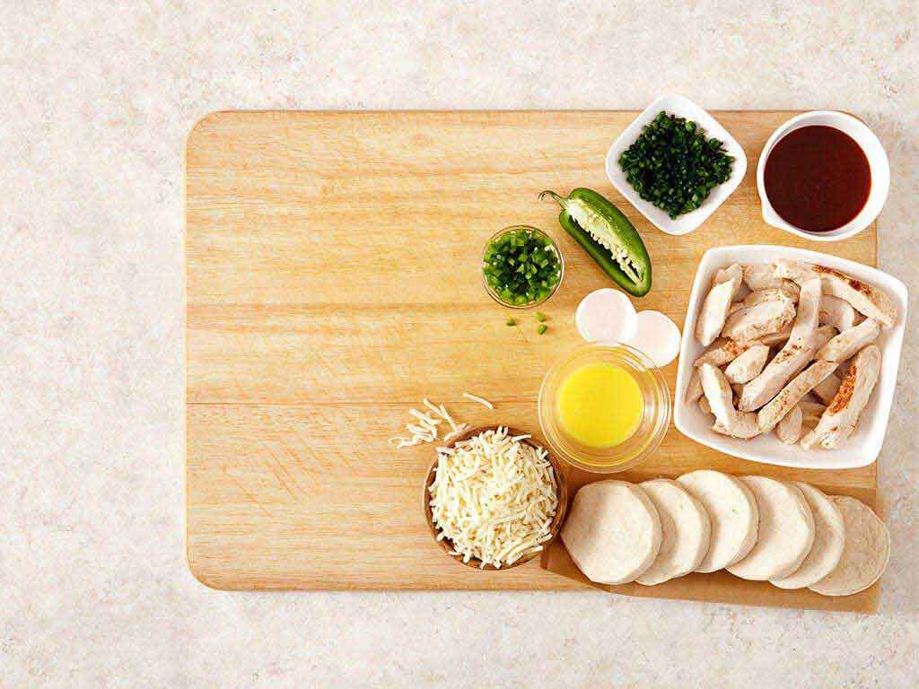 Chop the chicken strips into 1-inch pieces and combine with shredded cheese, barbecue sauce, green onions, and chopped jalapeno pepper.