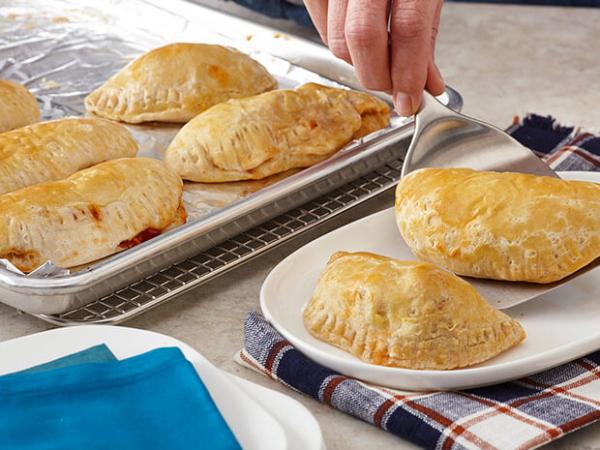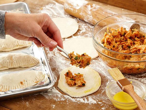 On a lightly floured surface, roll out each biscuit into a 4 ½ -inch round. Brush the edges with egg wash. Dollop a heaping tablespoon of chicken mixture into the center of each biscuit. Fold in half and crimp with a folk to seal.