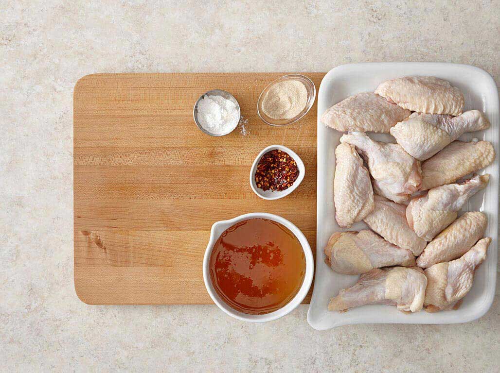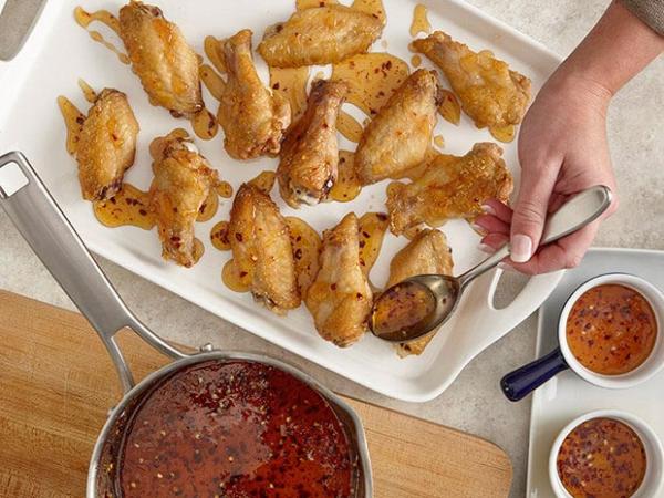 Pour the hot honey dipping sauce into bowls and serve with crispy dry wings.