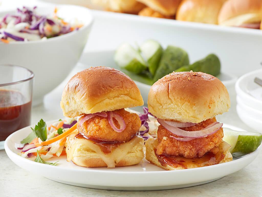 Serve the BBQ Popcorn Chicken Sliders with coleslaw, pickles and extra BBQ sauce for dipping.