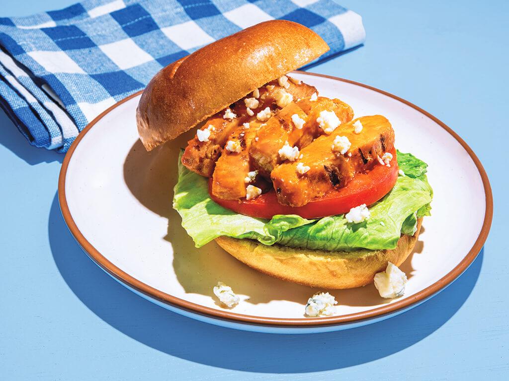 Spoon chicken on top of the lettuce and tomato. Garnish with blue cheese crumbles.