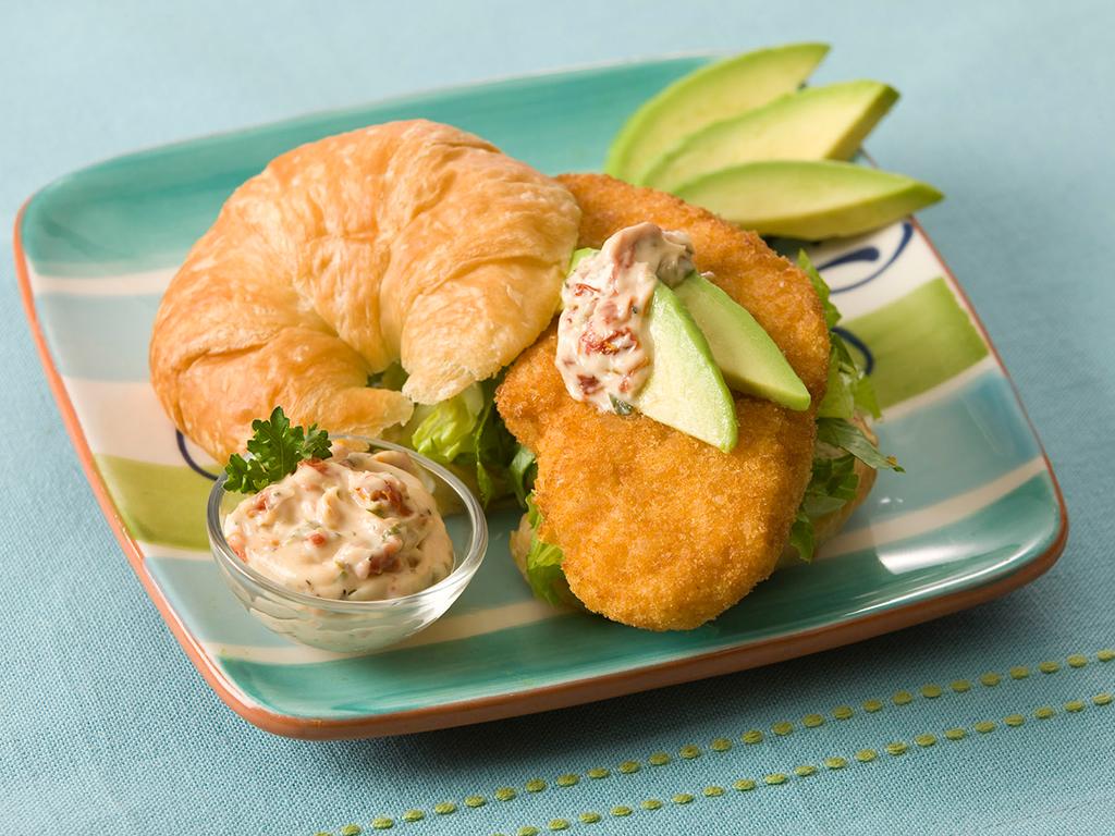 Spread insides of each croissant with tomato mayonnaise. Place lettuce on croissant bottoms. Top each with 1 chicken tenderloin and avocado slices.