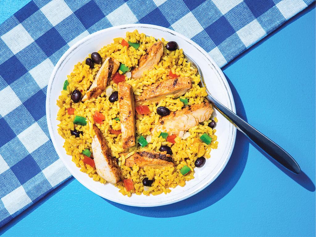 In skillet with chicken and bean mixture, stir in cooked rice until combined. Mix is cheese, stirring until melted. Serve warm.