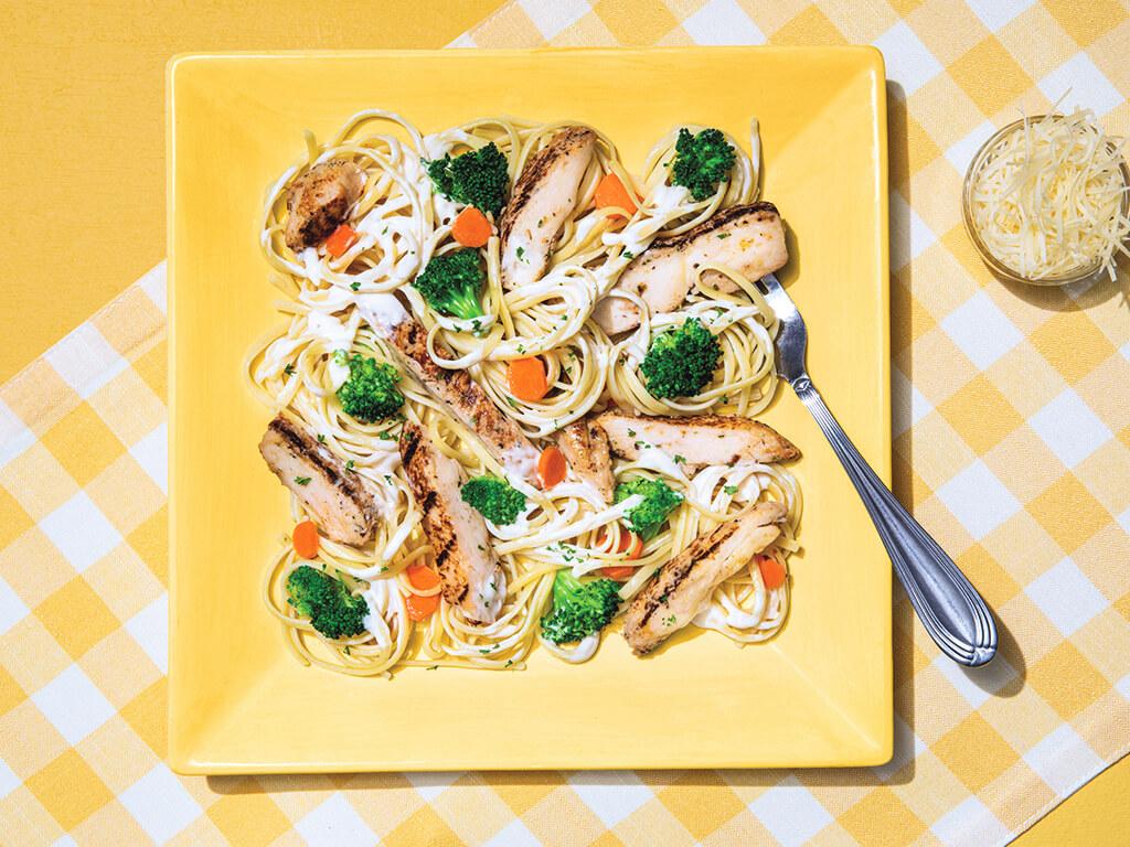 Meanwhile, in medium saucepan, heat chicken and Alfredo sauce over medium-high heat, stirring occasionally, 5 minutes.