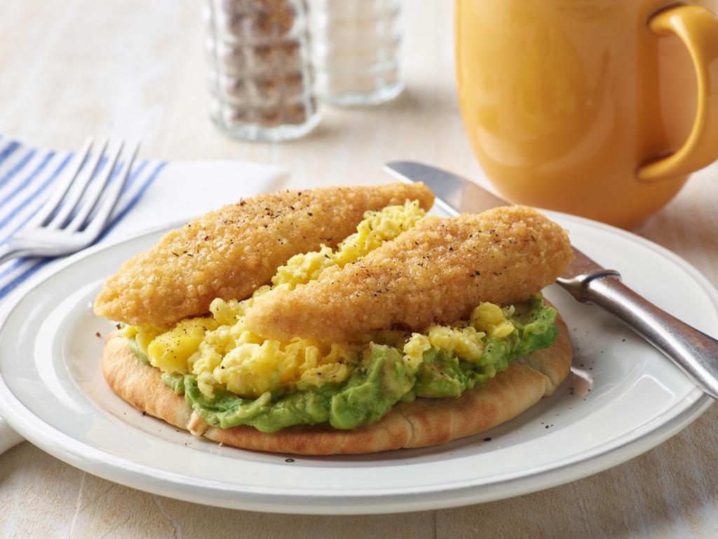 To serve, spread some of the mashed avocado over the toasted pita bread. Top with a portion of the scrambled eggs and 2 crispy chicken strips.