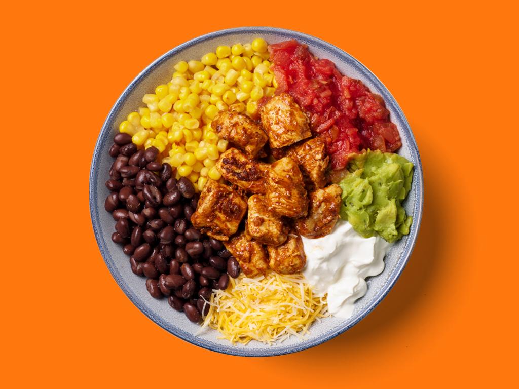 Layer rice in a bowl and top with beans, corn, chicken, guacamole, salsa, cheese and sour cream.