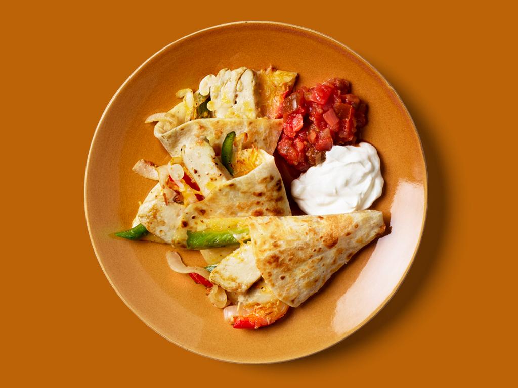 Add a generous amount of cheese over half of each tortilla. Add peppers and onions evenly between the 4 tortillas, then add 4 to 5 pieces of PERDUE® SHORT CUTS® Roasted Chicken Strips to each tortilla half. Fold each tortilla over.