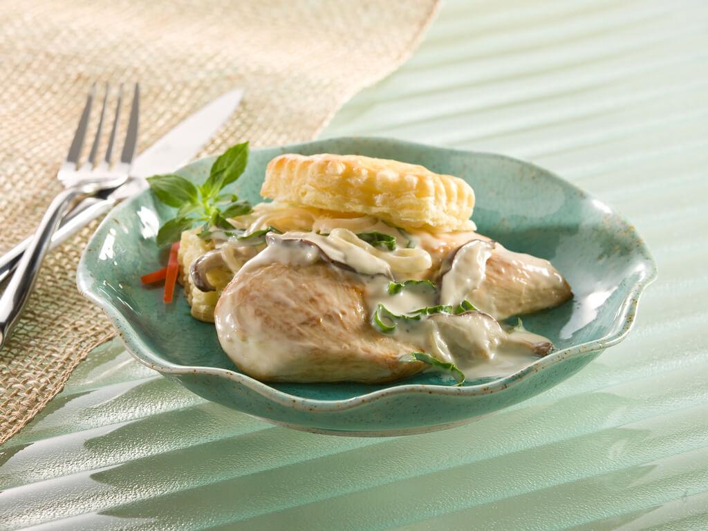 Cut the puff pastry in half and serve the chicken on the bottom half with the sauce over the top. Finish by placing the top of the puff pastry onto the top of the chicken.