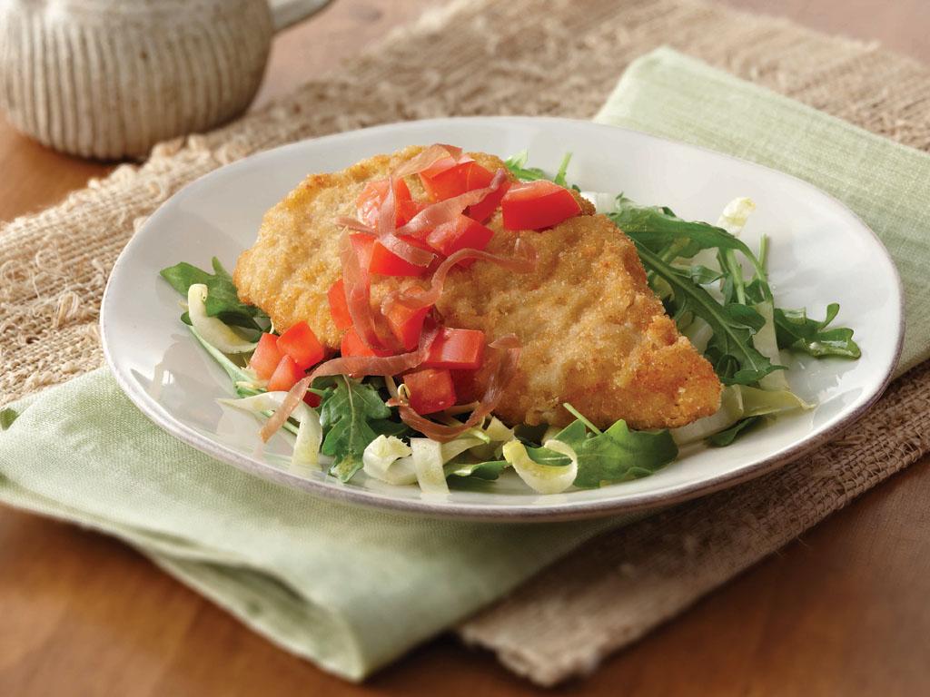 Divide salad mixture among 4 plates, about 1 cup per plate. Top each with a crispy, hot PERDUE® SIMPLY SMART® Lightly Breaded Chicken Filet and garnish top with 1/3 cup diced tomato and approximately 1 tablespoon crisp-baked prosciutto shreds, if desired.