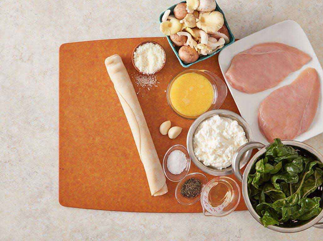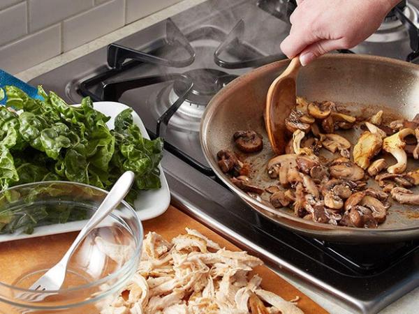 Season the PERFECT PORTIONS® chicken breasts with 1/2 teaspoon salt and 1/4 teaspoon black pepper. In a large skillet, heat 2 tablespoons of olive oil over medium high heat. Add the chicken and sauté for 3 to 4 minutes per side until cooked through. Chicken is done when a meat thermometer inserted in the center reaches 170°F. Transfer to a cutting board to rest. When cool enough to handle, shred chicken into bite sized pieces. To the same skillet, heat 1 tablespoon of olive oil then add the mushrooms. Season with 1/4 teaspoon salt and 1/8 teaspoon black pepper. Sauté until mushrooms are golden brown, about 5 to 7 minutes. Transfer the mushrooms to a bowl. Heat the remaining tablespoon of oil over medium heat. Add the garlic and sauté about 30 seconds. Add the Swiss chard, cover and sauté until wilted, about 3 minutes. Season with 1/4 teaspoon salt 1/8 teaspoon and black pepper. Transfer the Swiss chard to a plate to cool.