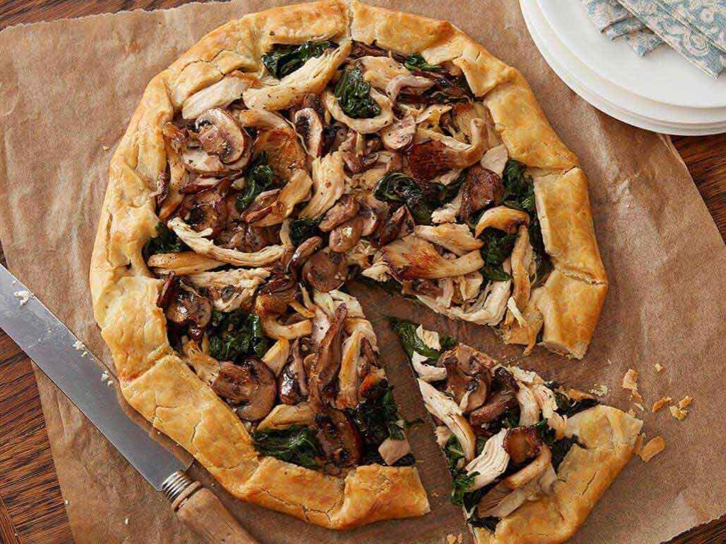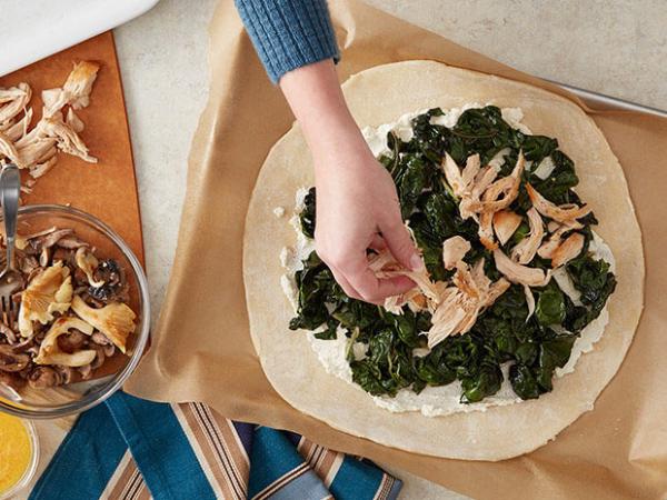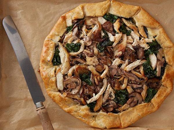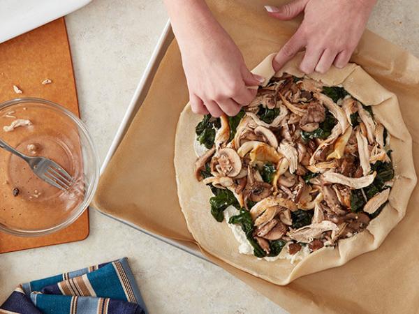 Preheat your oven to 400°F. Fold the edges of the dough up and over the chicken filling, creating a 1-inch border. Brush the dough border with the beaten egg. Bake until crust is golden brown and the filling is heated through, about 30 to 35 minutes. Remove the galette from the oven and let cool.