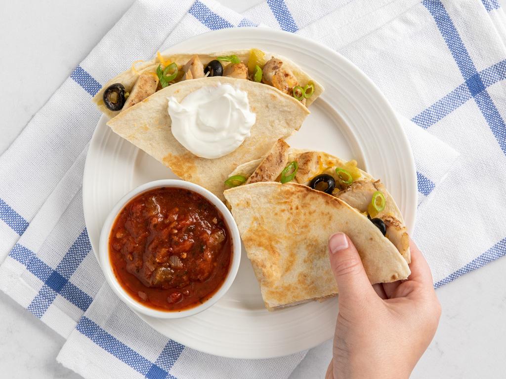 Evenly spread two tortillas with chilies. Top with chicken, olives, green onions, cilantro, cheese, and another tortilla.