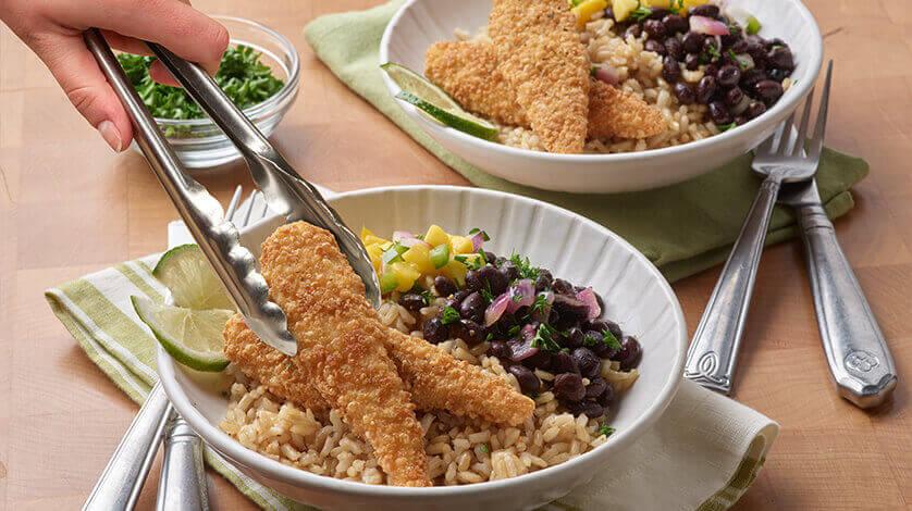 Microwave the brown rice according to package directions. Stir in the chopped cilantro and divide between 4 bowls. Top with desired amount of mango salsa and black beans. Top with 2 chicken tenders. Squeeze lime juice over all and garnish with cilantro leaves if desired.