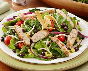 In large serving bowl, toss together romaine lettuce, beans, corn, cheese, tomatoes and onions. Drizzle with reserved dressing, tossing to coat completely. Top with chicken and tortilla strips.