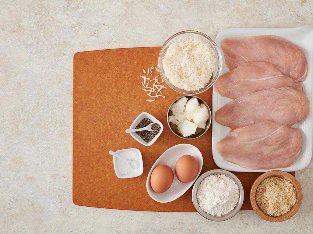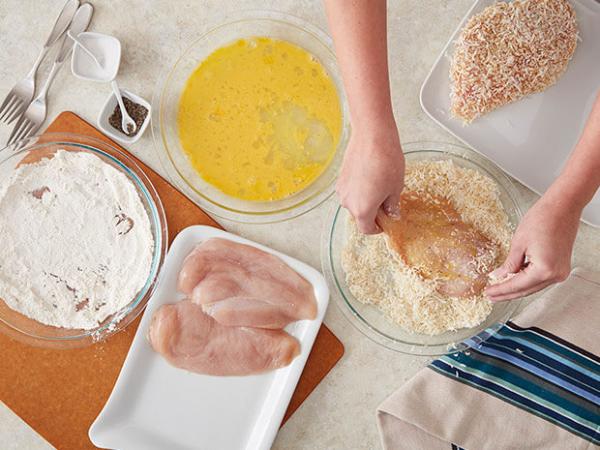 First, dredge each Perfect Portion lightly in flour. Then dip the floured chicken in the egg wash, letting the excess drip away. Next, dredge the egg washed chicken in the coconut-panko mixture, pressing lightly to make sure the coconut sticks.