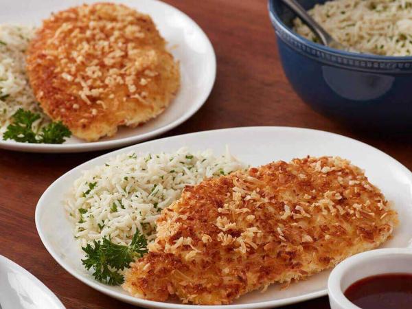 Serve Crispy Coconut Chicken with Basmati rice and your choice of dipping sauce. Sweet and sour, citrus chili or peanut sauce.