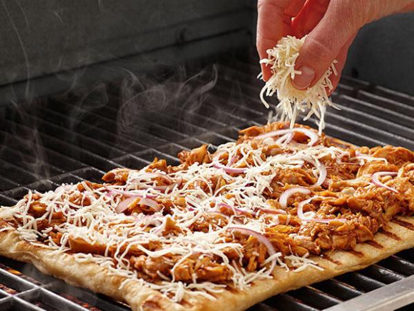 Sprinkle pizza with shredded cheese while it's still on the grill. Remove chicken pizza from the grill onto a cutting board. Sprinkle with chopped green onion and cut into serving size pieces.