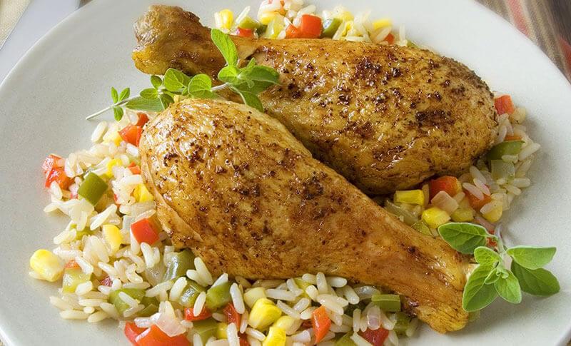 Stir in broth, corn and rice. Return chicken to pan; bring to a simmer over medium-low heat. Cover and cook 12-15 minutes until chicken is 180°F internal temperature. Uncover and stir rice to absorb any remaining liquid.