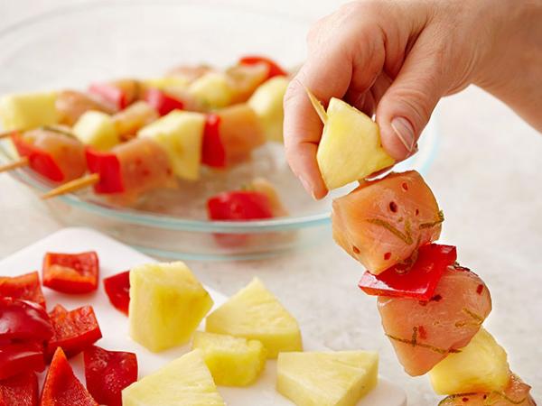 Thread alternating pieces of chicken, pineapple and red bell pepper onto skewers. Discard remaining marinade.