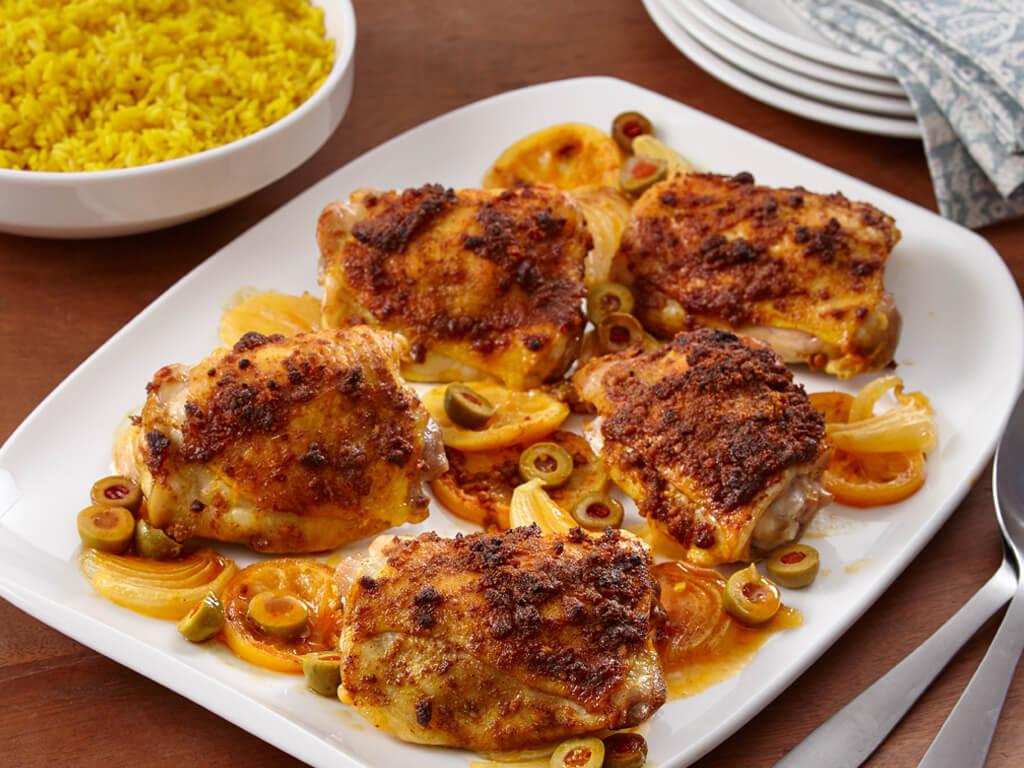 Remove chicken from sheet pan. Transfer vegetables to a serving platter and place the chicken thighs on top. Serve Easy Moroccan Sheet Pan Chicken with olives alongside yellow rice. Garnish with lemon, if desired.