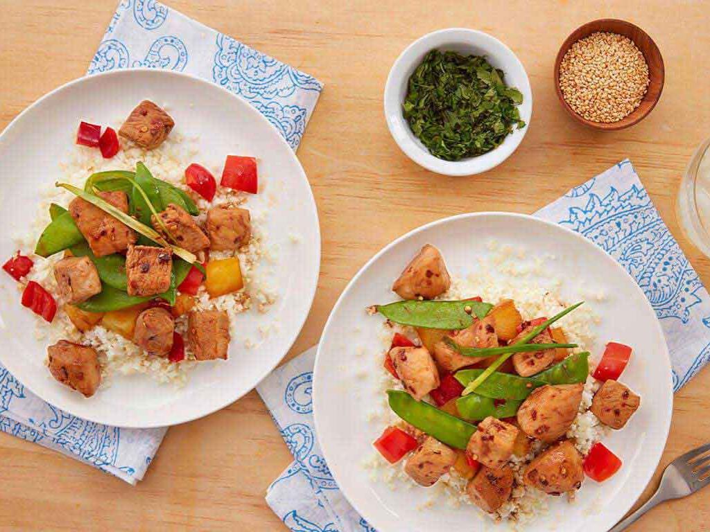 Lay out 4 large sheets of heavy-duty foil. Build each piece of foil with ½ cup pineapple chunks, ¼ cup red bell pepper and 5 to 6 snow peas. Divide the chicken between the 4 foil packets and then top with scallion ribbons.