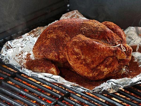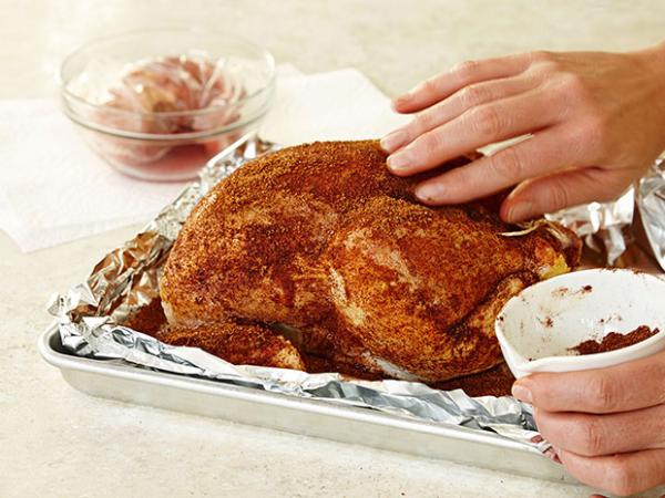 In bowl, combine the chili powder, brown sugar and paprika. Remove the giblets and then rub the roaster all over with the spice mix. Let the roaster sit at room temperature for about 7 to 10 minutes while the grill heats up.