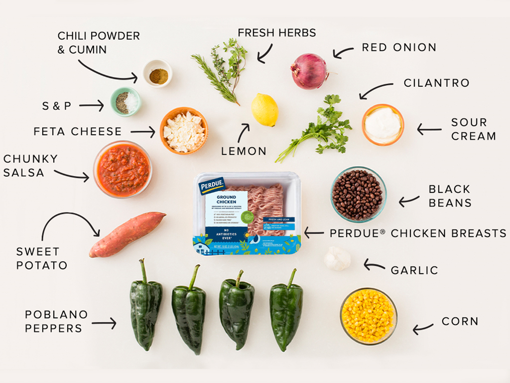 Clean and dice the sweet potato and red onion. Mix ground chicken, black beans, corn, onion, sweet potato, tomato salsa, cumin, chili powder, salt and pepper.