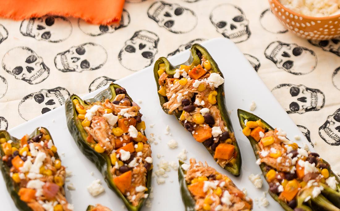 Divide mixture evenly in each poblano pepper half. Cover the pan with foil and bake for 40 minutes or until the peppers are fork tender. Remove from oven and garnish with feta cheese and cilantro.