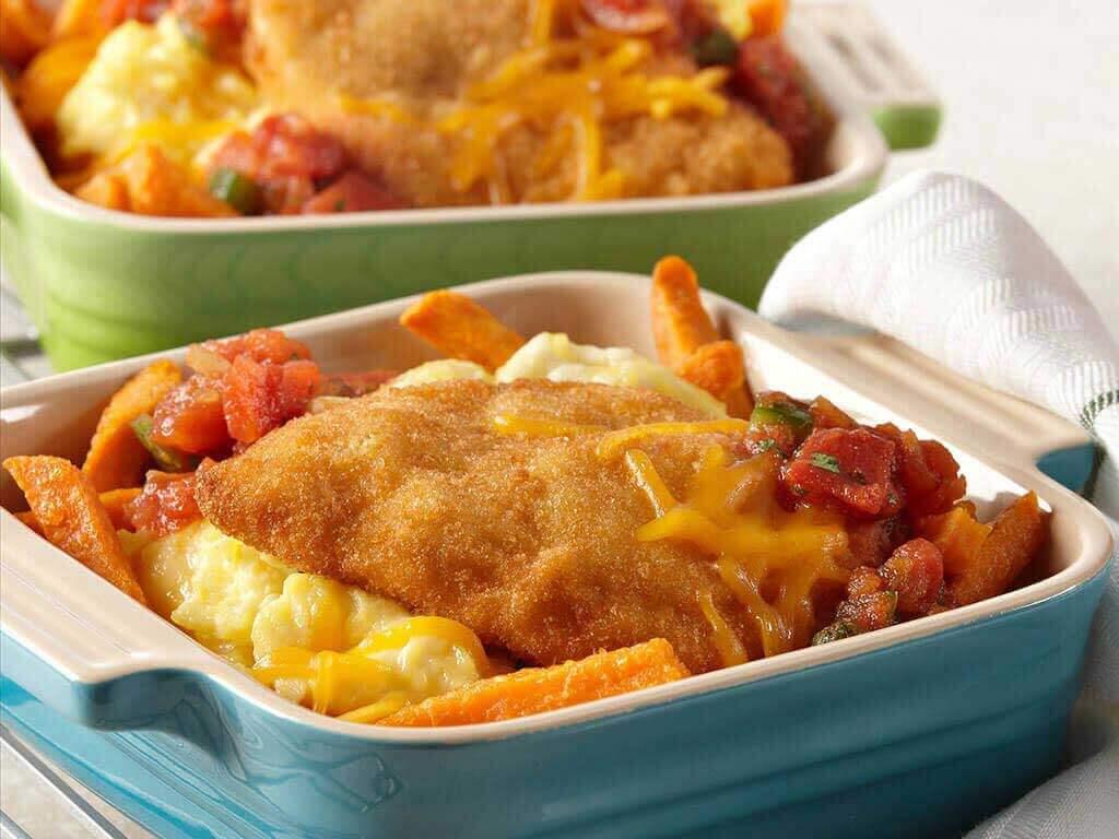 In each of 4 individual 12-ounce casserole dishes, layer: 1/2 cup crisp sweet potato fries, 1/4 cup scrambled eggs, 1 baked chicken cutlet, 2 tablespoons mild salsa, and 2 tablespoons shredded cheese.