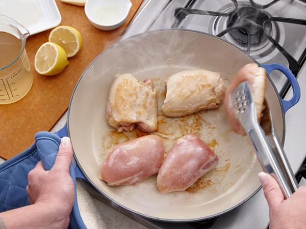Season chicken thighs with salt and black pepper. Heat the olive oil in a large stockpot or Dutch oven over medium heat. Add the chicken and sauté for 10 minutes until brown.