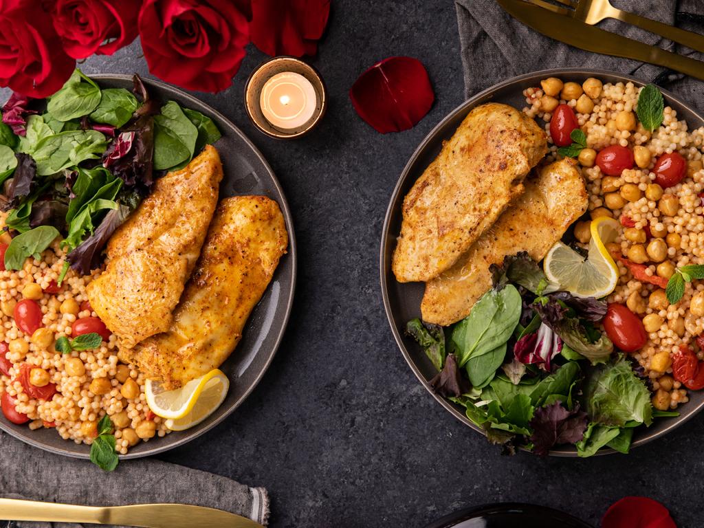 To serve, toss the chickpeas and tomatoes with the couscous. Portion onto a dinner plate. Top with a chicken breast. Sprinkle with cilantro or mint leaves and a squeeze of lemon.