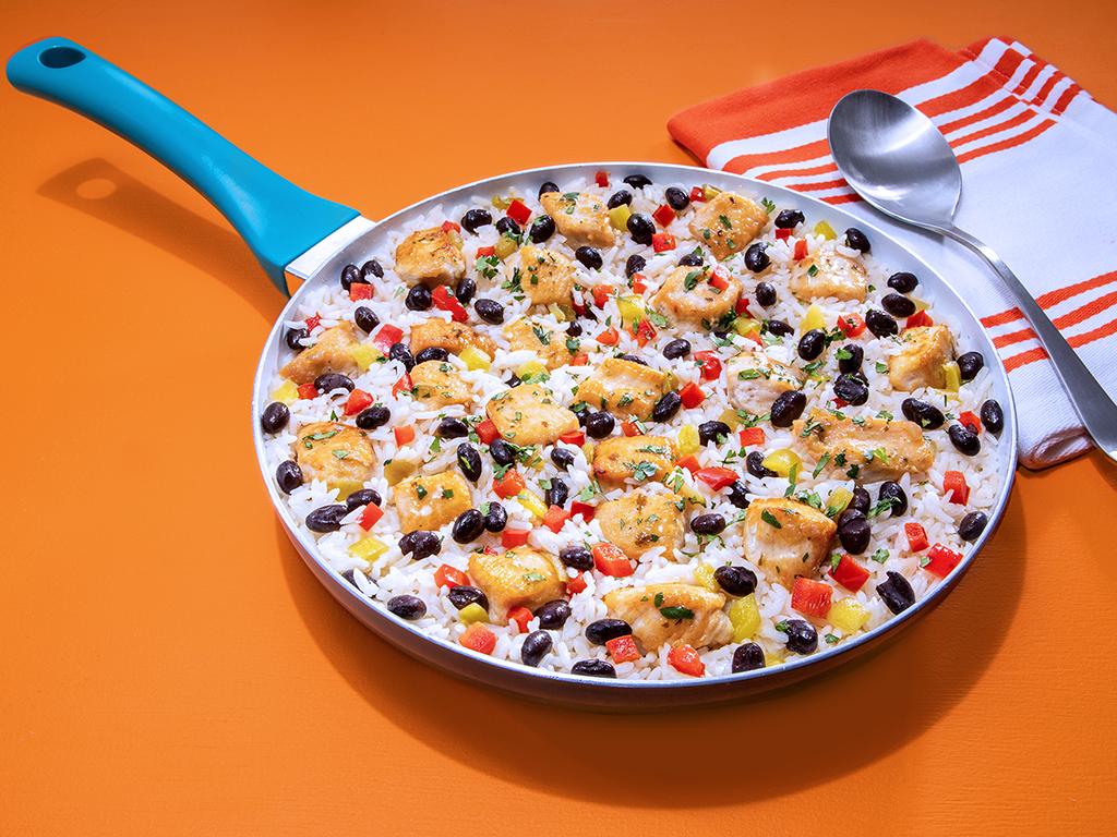 In the same skillet, add jasmine rice and stir about 1 min, until rice begins to turn opaque. Add chicken stock and Reciato and stir until well mixed. Next, add black beans, diced green chilies, red bell pepper and brown chicken cubes. Stir until well mixed and bring to a boil.
