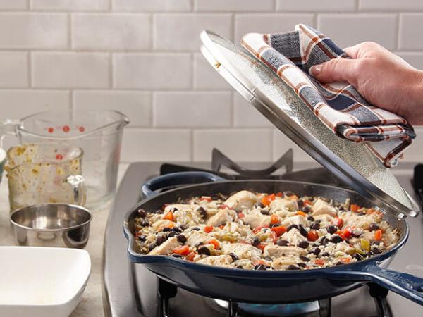 Cover skillet and turn heat to low. Simmer for 20 mins, until rice is tender and chicken is cooked through. Chicken is done when meat thermometer inserted into the center reached 170°F.