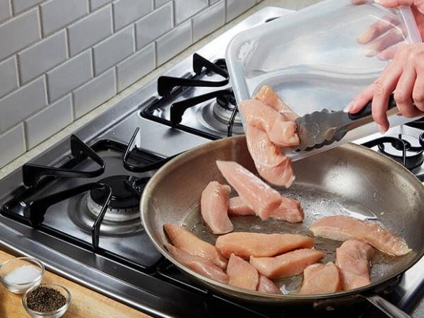In a skillet, heat 2 tablespoons of olive oil over medium-high heat. Add the chicken and season with salt and black pepper. Sauté until chicken is golden brown and cooked through, about 7 to 10 minutes. Chicken is done when a meat thermometer inserted in the center reaches 170°F. Remove chicken to a plate to cool.