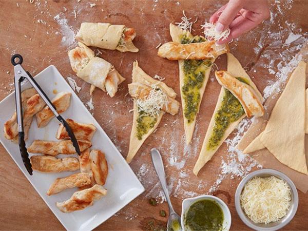 Unroll each triangle of crescent dough. Spread about 1 teaspoon of pesto over the dough. Lay 1 to 2 pieces of chicken at the wide end of each triangle. Spoon about 1 teaspoon of shredded mozzarella cheese on top of the chicken. Roll the crescent dough around the chicken and place on a foil lined baking sheet sprayed with cooking spray.