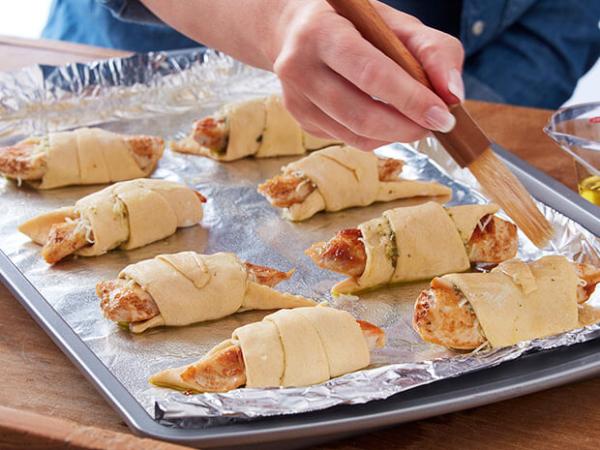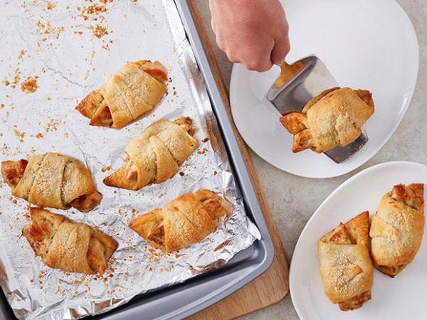 Preheat your oven to 375°F. Bake the Parmesan Pesto Chicken Roll-Ups for 15 minutes until crescent rolls are golden brown. Serve warm or room temperature.