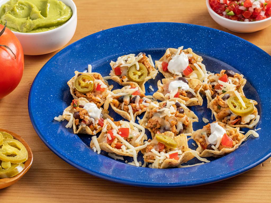 Spoon turkey mixture evenly into each scooped tortilla chip and place on a large baking tray. Top with shredded cheese. Bake for 4 minutes. (Alternative microwave heating: microwave filled tortilla chips in small batches on high setting for 20 seconds.)