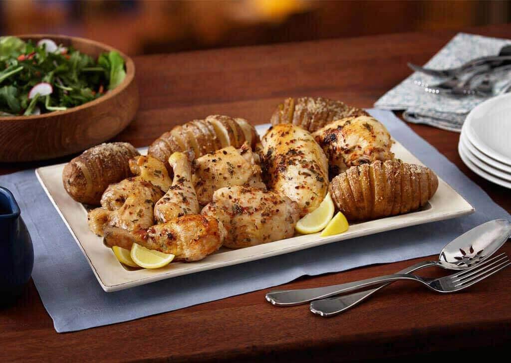 Remove the chicken and potatoes from the oven. Let the chicken rest for 5 to 10 minutes before carving. Pour the Peri Peri pan juices into a serving container. Serve Peri Peri Chicken with potatoes, sauce and lemon wedges.