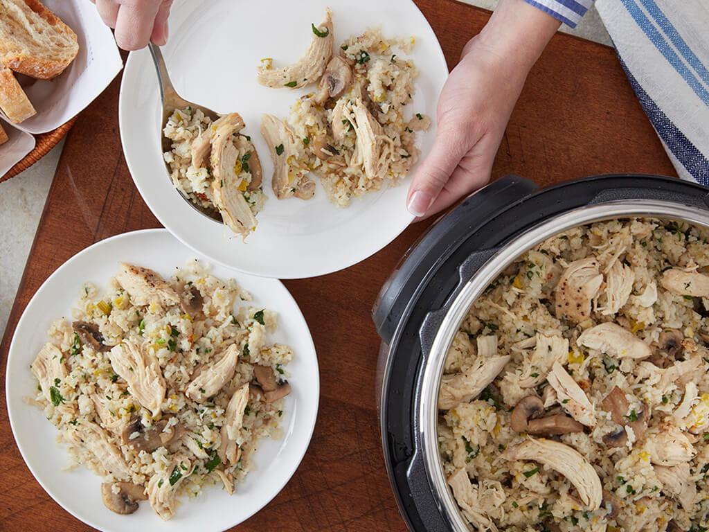 To serve Pressure Cooker Chicken and Rice, use two forks to shred the chicken and stir into the rice. Stir in the grated Parmesan and chopped parsley. Serve with a glass of White Wine, buttered bread and extra Parmesan on the side.