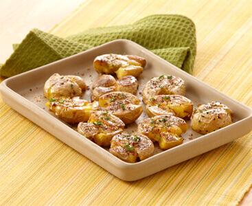Drizzle oil evenly inside a low-sides baking sheet and sprinkle liberally with salt, pepper and herbs evenly over oil. Place potatoes on oil in pan and set 1 1/2 to 2 inches apart. With the palm of your hand, gently smash the potatoes to create pancakes about 1/2 inch thick.