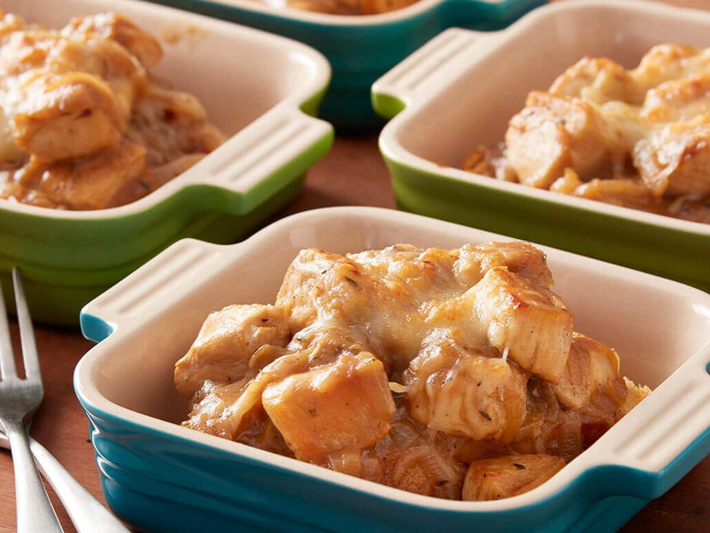 Preheat your broiler to high. For each serving, place a slice of toasted bread in a low-rimmed soup or pasta bowl. Ladle the French onion chicken gravy over the toast. Top with a cup of shredded cheese and place under the broiler for 2 to 3 minutes, until the cheese is melted and brown. Serve with green salad and a glass of white wine.