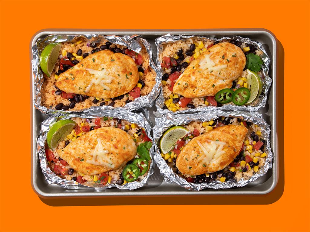 Remove packets from the grill and carefully open. Sprinkle the shredded Cheddar on top of each chicken breast. Close the foil and let sit for 2 to 3 minutes until the cheese has melted and the chicken has rested. Serve in the foil packet with lime wedges on the side.