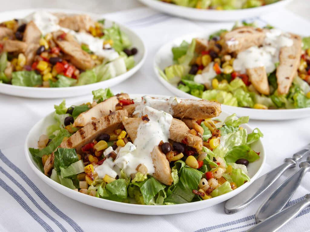 Spoon the jalapeño ranch dressing over the chicken salad. Top with tortilla strips and serve.