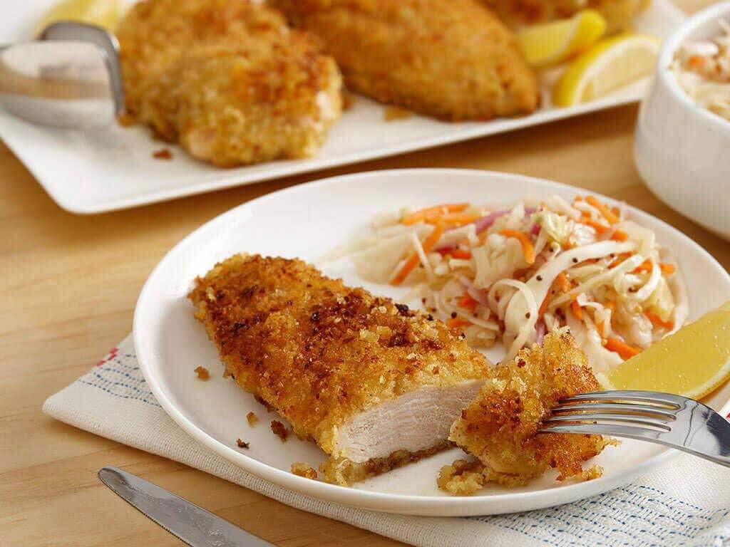 Dip the chicken breasts in the mustard-orange mixture and coat well. Then press the chicken breasts into the breadcrumbs to adhere well.